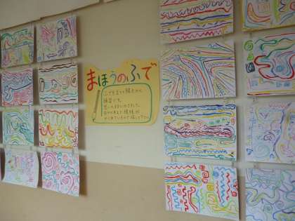 図工室につながる渡り廊下に、3年生の作品「まほうのふで」という絵が飾ってありました。筆を立てて線を引く練習を兼ねた作品だそうです。こうして壁いっぱいにカラフルな作品があると、何だか明るい気持ちになりますね。