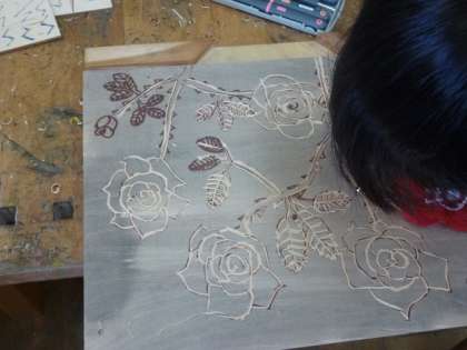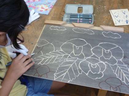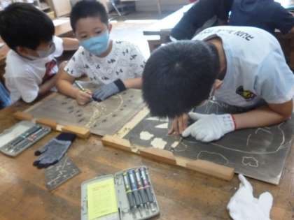 図工室で版画の版を彫っていたのは4年生です。みんな軍手で手をカバーして、注意深く彫っています。印刷したら、どんなふうに仕上がるのか楽しみですね。