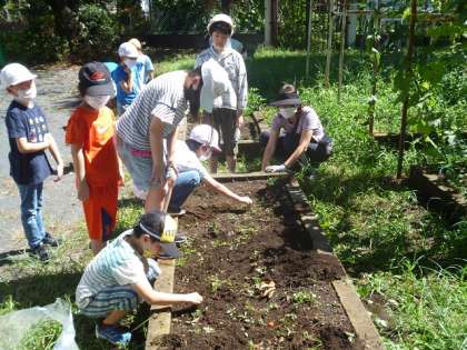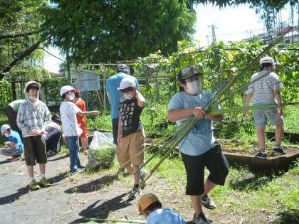 つくし学級は暑い中、最後の夏野菜を収穫した後に、すべて抜いて畑を元通りにしました。草取りをしたり、支柱を片付けたりと、みんな頑張って働きました。