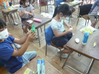 2組では、紙粘土を使ってマグネットクリップを作っていました。紙粘土で好きな形を作ります。どこにも売っていない、自分だけのオリジナルクリップができるのですね。わくわくします。2組も図工専科の先生にカッターの使い方を教わります。