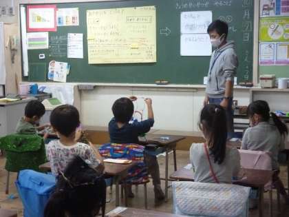 学校が再開してから植えて、夏の間きれいな花を楽しんだアサガオでしたが、最後につるでリースづくりをしました。「見て見て!かざりも付けたの。」と、嬉しそうにリースを見せてくれました。