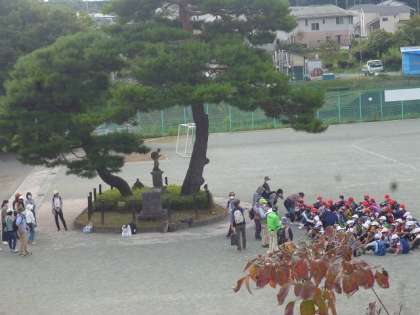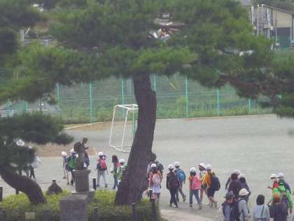 校舎から校庭を見下ろすと、ちょうど4年生がエコ広場のみなさんと湯殿川の学習にでかけるところでした。4年生、気を付けて行ってらっしゃい。たくさん勉強してきてね。