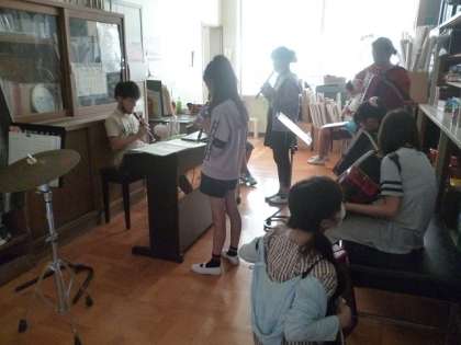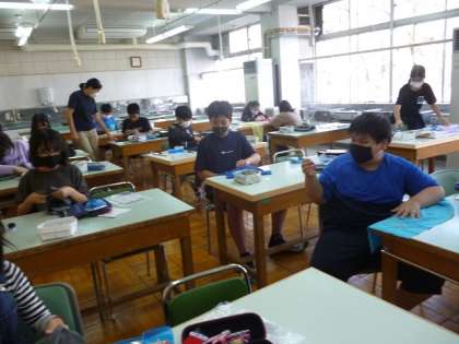 6年生はクッション作りをしています。今は布に手縫いで刺しゅうをしている段階です。半分の人たちは、合奏の練習をしていました。宇宙兄弟のメインテーマ 〜ロケットロード〜 だそうです。いい曲でした。