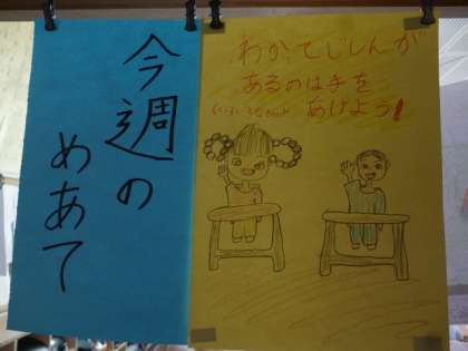教室の入り口に、こんな張り紙がしてありました。今週は頑張って手を挙げよう!…ということのようですね。めあてが達成するといいですね。
