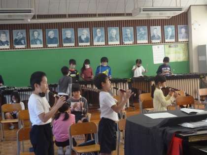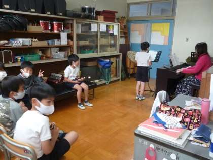 音楽室では、それぞれがリコーダーで「オーラリー」の練習をしていました。となりの準備室では、リコーダーのテストが行われています。待っている人に背を向けて演奏するなど、感染症への対策もしっかりなされていました。
