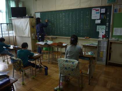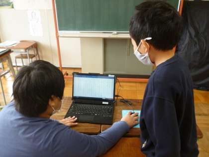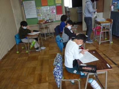 つくし学級では、3つのグループに分かれて学習や活動が進んでいました。言葉の学習で「食べ物しりとり」を行っていたグループは、「け」から始まる食べ物が出尽くして困っていたところで、ジェスチャーでヒントを出すと「あっ、毛ガニだ!」と気付いてくれました。隣の部屋では、タブレットでお楽しみ会の司会原稿を作り、もうひとつのグループは、それぞれに合ったプリントで、文字や言葉、読解の学習をしていました。