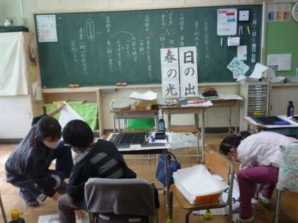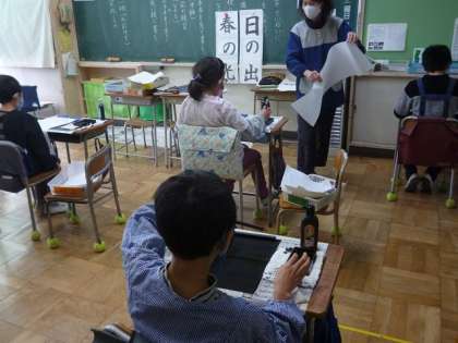 つくし学級では習字セットが用意され、書初めの練習が始まるところでした。学級の中で硬筆の書初めを書くのは1人。あとはみんな毛筆です。「名前を書くスペースを残して書きますよ。」と先生からアドバイスがあり、いよいよ書初め用紙が配られました。力強くしっかり書いてくださいね。