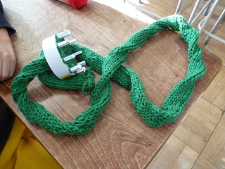 マフラーに挑戦です。落ち着いて丁寧に編んでいます。