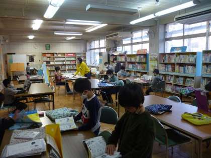月曜日の1校時は、つくし学級が図書館で読書をします。お菓子の本を見ている人、物語を手にしている人、危険な生き物を集めた本を熱心に見ている人、それぞれが興味をもった本を読んでいます。