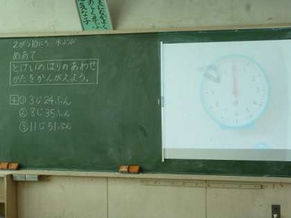 時計を使い、何時何分までの読み方を学習します。