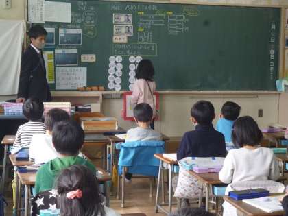 100をこえる大きな数について、100を10個のまとまりにして1000として数えていくとよいことを学びました。子供たちは、お手製の100円玉を使って、操作しながら十進法の考え方を自然に身に付けていきました。