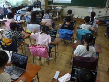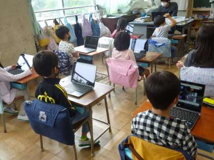 1年2組では、タブレットでクラスルームに入る練習をしていました。ある子の後ろに立っていたら、その子のカメラに映り込んでしまったらしく、「校長先生がいる!」と、大騒ぎになりました。子供たちは、どんどん操作が上手になっていきます。