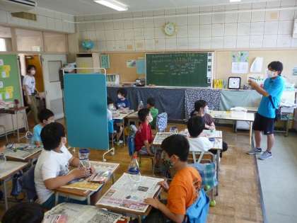 つくし学級では、「水遊びおもちゃをつくろう」というテーマで、「水族館バケツ」を作るようです。これからペットボトルに海の生き物を描いていくところでした。絵が思い浮かばない人は、タブレットで画像を探すところから始めていました。