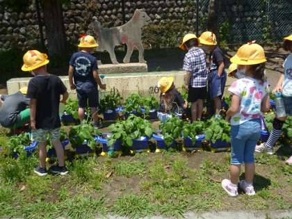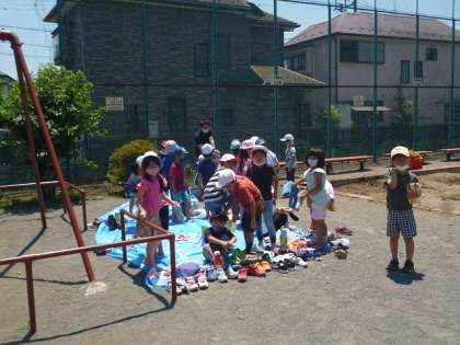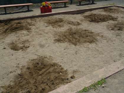 1年1組は、外でアサガオやプランターに植えた花の苗の観察を、2組は図工の先生と一緒に砂場で造形遊びをしました。残念ながら造形遊びは終わったところでしたが、何を作ったのかたずねると、「おおきい山!」「かざん!!」という答えが返ってきました。確かに山を崩したあとがたくさんありますね。