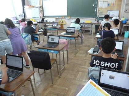 4年生は、湯殿川について調べるテーマに沿って、撮影してきた写真にコメントを付けるという活動をタブレットで行っていました。みんな操作がスムーズでびっくりしました。