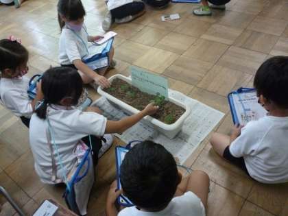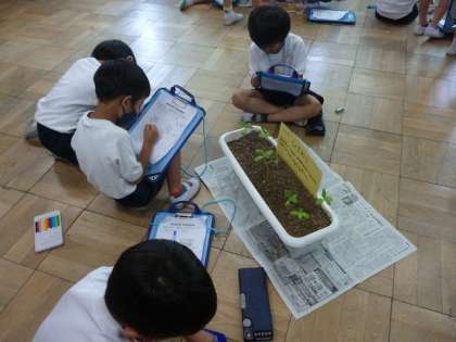 1年生の教室では、床に敷かれた新聞紙の上に苗が植えられたプランターが…。次の時間が体育なので、2時間続けて外の活動を避けるための苦肉の策だそうです。先生、考えましたね。