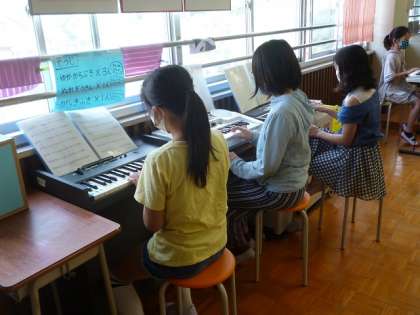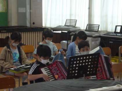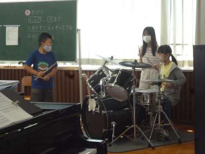 以前、5年生が「キリマンジャロ」という合奏曲に取り組んでいることをお伝えしました。その時は、それぞれの楽器が思い思いに練習していて、ただあっちからもこっちからも音が聞こえていただけでしたが、今日は、ドラムやピアノが演奏を始めると、自然にどの楽器グループもそれに合わせて演奏し始め、いつの間にか曲になっていました。さすが5年生!上達が早いです。