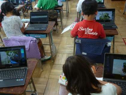1年生の教室では、タブレットで撮影した苗の様子を観察カードにかいていました。し〜んとした中で真剣に取り組んでいて、びっくりしました。タブレットも上手に使えるようになってきましたね。