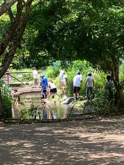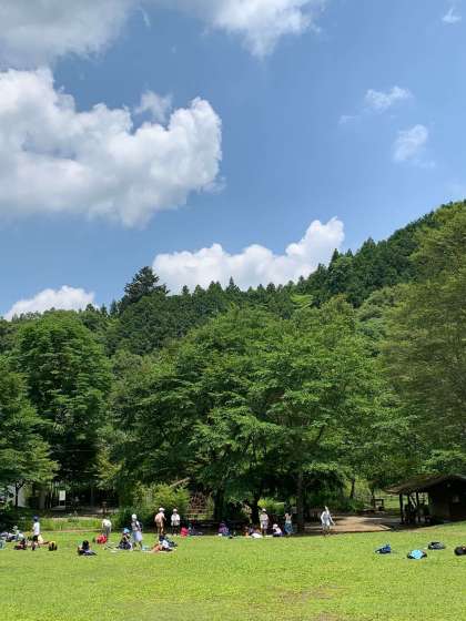 きれいな青空のもと、お弁当を食べ終わった子供たちは、楽しそうに遊んでいます。風がさわやかで気持ちがいいです。