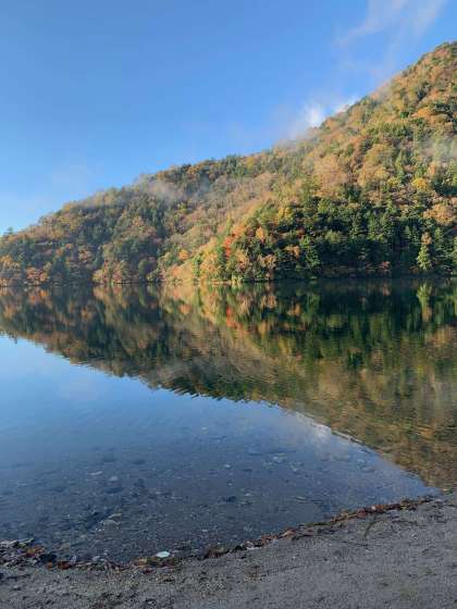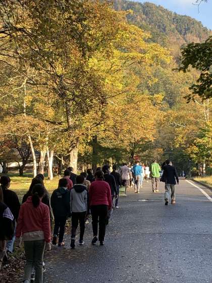 湯の湖の湖面に山の紅葉が映って、本当に綺麗です。宿まで戻る子供たちも、紅葉に包まれています。