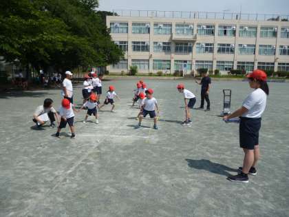 1時間目に、校庭にて1−1と6−1が合同体育を行いました。1年生が反復横跳びを測定する際、6年生が1年生の横に立ち、マンツーマンで記録を取ってあげました。6年生が優しく声かけをしたり、アドバイスをしたりすることで1年生もより分かりやすく種目に取り組み、頑張ることができました。