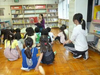 毎週月曜日は、学校司書が出勤し、各学級の図書指導があります。今日の3時間目は、2−2にて授業が行われました。授業の始めには子供たちを絵本コーナーに集め。様々な本の読み聞かせや紹介が行われました。