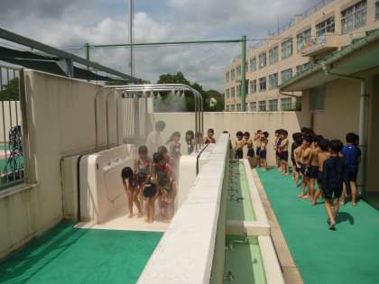 1・2時間目に、学校プールにて今年初の水遊び(水泳)が行われました。前日の着替えの練習を生かしてスムーズに準備ができた後は、学校プールへ。安全確認の後、シャワー。由井三のプールシャワーは人感式のセンサーが付いた温水シャワーになっており、子供たちは温水を浴びてから再びプールサイドへ向かいました。