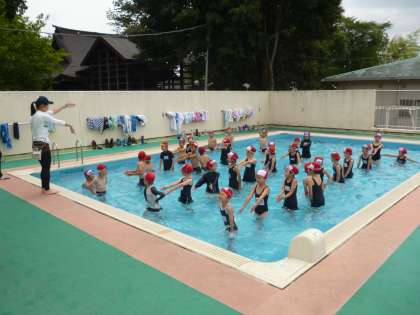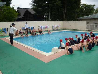 その後、いよいよ入水。先生の指示に合わせて徐々にプールに入りました。2年生は全員が一斉にプールに入り、いるかなど動物のまねっこ水慣れ遊びを楽しみました。慣れてきた後はプールの両端を使い、歩いたり走ったりしたり、壁を蹴ってバタ足で水の中を進む学習に取り組みました。
