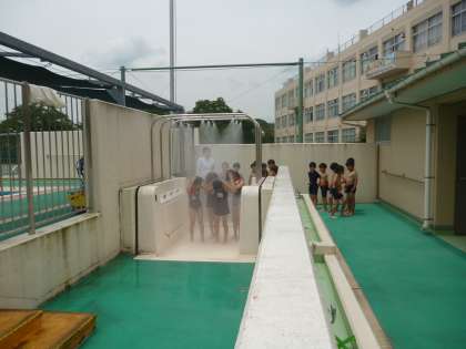 3・4時間目に、学年で合同体育「水遊び(水泳)」を行いました。今年初のプールでの学習は、教室で約束したことを確認するところから始まり、準備運動、温水シャワーとプールに入る準備を進めました。