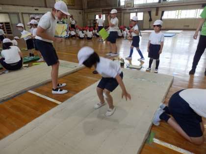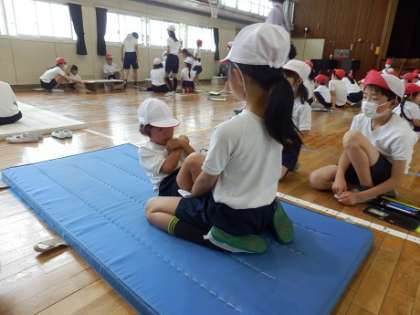 今日の午前中は、体力テストを行いました。1年生は、たてわり班の6年生にアドバイスをもらったり、記録をしてもらったりしながら、初めての測定に臨みました。1年生が力いっぱいがんばると、6年生から自然に拍手が起こったりするあたたかい雰囲気の中で、今日のメニューである「ソフトボール投げ」「立ち幅跳び」「上体おこし」「長座体前屈」を無事終えました。来週は、20mシャトルランで、また6年生にお世話していただく予定です。6年生のサポートの元で、また力が出せるといいですね。