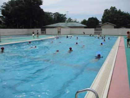 今日の水泳の学習では、けのびで長く泳ぐ練習をしました。水の中で足を蹴る練習もしました。
