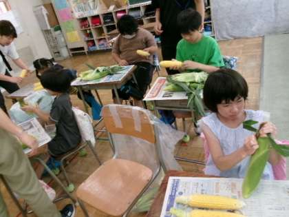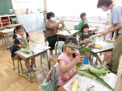 栄養士の田中先生から、とうもろこしについての話を聞き、中西農園の動画を観ました。そのあとに、とうもろこしのかわをむきました。むいたとうもろこしは、本日の給食で茹でとうもろこしとして食べました。つくしさんが頑張ってむいたとうもろこしは美味しかったです。