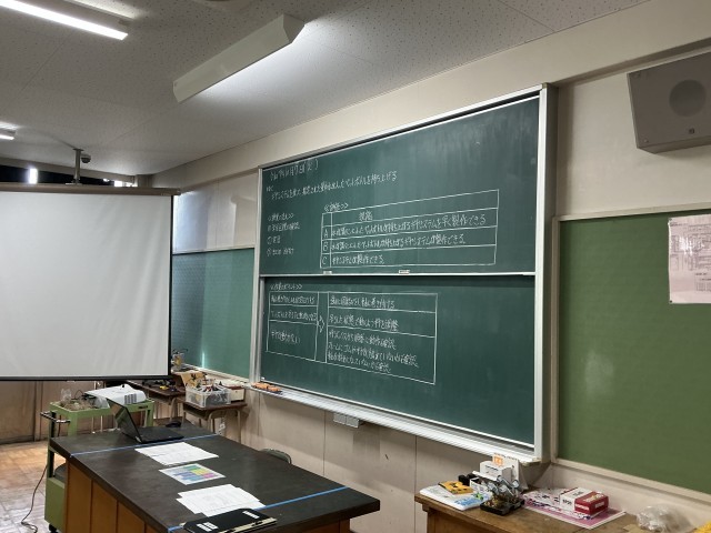 本日5校時、2年生の技術では、本校指導教諭による模範授業が行われ、他校の先生方が参観されました。「ギアシステムを使って、指定された量の水が入ったペットボトルを持ち上げる」を目標に、生徒たちは動力伝達の仕組みを考えながら実習に取り組みました。