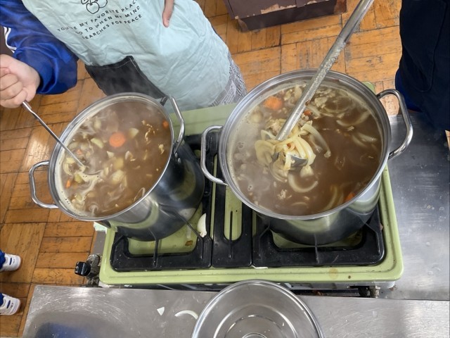 雨天のため、各小学校で予定していた地域周辺の清掃活動は残念ながら中止となりましたが、本校では校内清掃とアルファ米を用いたカレー作りの炊き出し訓練を行いました。