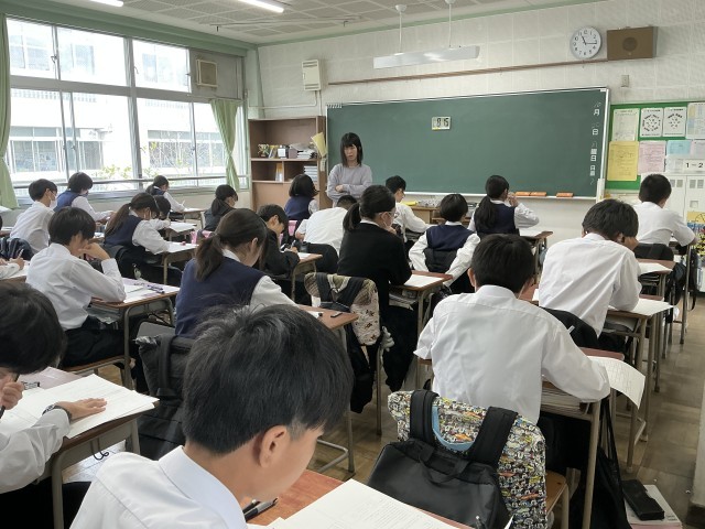 2年生の英語では、少人数に分かれて学習を進めています。授業では、教科書「Lesson6」の本文を、生徒は教員の発音に続いて声に出す音読練習を通じて、発音やイントネーションの習得に取り組んでいます。