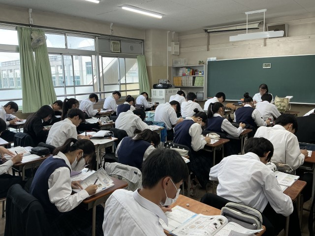 2年生の英語では、少人数に分かれて授業を行っています。授業では、「比較のさまざまな言い方を確認すること」を目標とし、個人演習として各自がワークシートに記入しています。