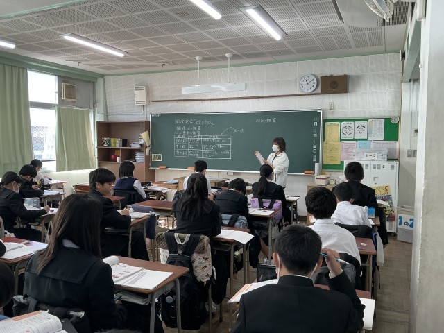 1年生の家庭科では、「焼きうどん」の調理実習に向けて、教科書を用いながら調理の性質について学習し、教員が黒板に要点をまとめ、生徒たちはノートに板書を写し取っています。