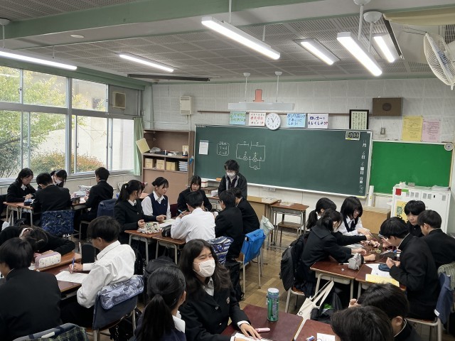 2年生の理科では、「電気回路」について学習しています。授業では、回路計を用いて電圧を測定し、回路における電圧の特徴について、班で話し合いながら考察しています。