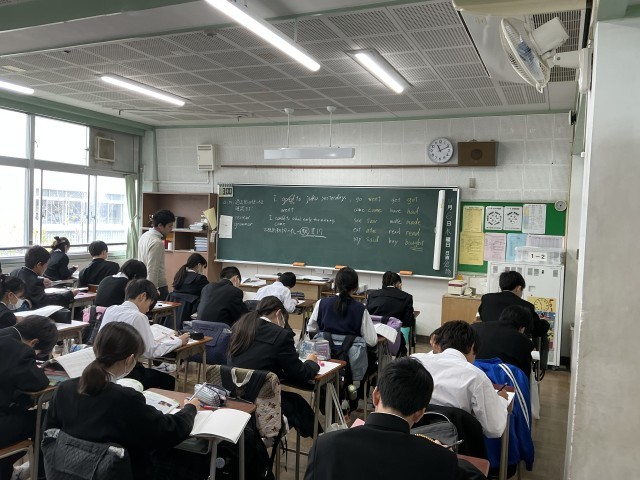 1年生の英語では、少人数に分かれて授業を行い、教科書「Lesson7」の単元で過去形の使い方を学習しています。授業では、プリントを用いて問題演習に取り組んでいます。