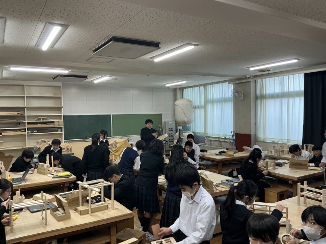 1年生の技術では、「木材加工」の実習に取り組んでいます。部品加工をしたパーツを接合し、サンドペーパーを使って各自で磨いています。