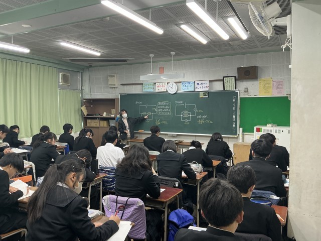 2年生の理科では、「直列回路と並列回路」について、教員が板書を用いて丁寧に解説しています。