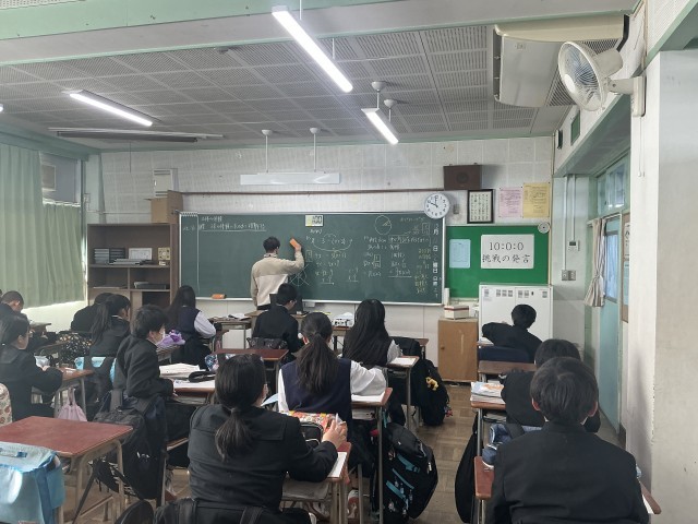 1年生の数学では、習熟度別の少人数に分かれ授業を行い「立体の体積」の単元に取り組んでいます。黒板の板書を用いて、考え方や手順を丁寧に説明しています。