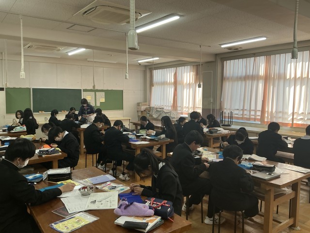 1年生の家庭科では、「アレンジ文庫本カバー」の製作において、刺繍の実習に取り組んでいます。