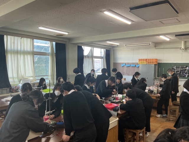 2年生の理科では、電熱線から発生する熱量について実験を行い、班ごとでデータを測定し、結果をワークシートに記入しています。