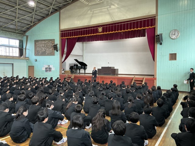 本日、2学期終業式を行いました。校長先生からは、「自分自身を大切にすること」「『わかる』を『できる』につなげる」の二つについてお話がありました。生徒代表の言葉では、生徒会長から各学年における2学期の成長について発表がありました。また、生活指導主任の先生からは、「新しい年を迎えるにあたり、気持ちを新たにし、目標を立てることの大切さ」についてお話がありました。