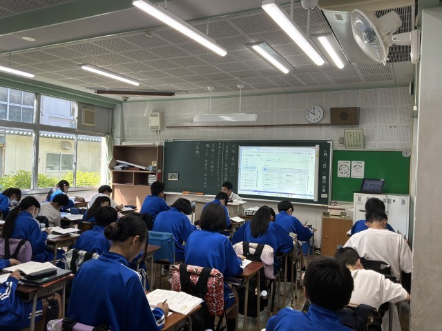 2年生の理科では、「物質のもととなる粒子」について学習しています。授業では、タブレット端末に板書内容をワークシートに投影し、せいとが見やすくなるよう工夫しています。また、 教員の発問について周囲の生徒と話合い活動を行い、協働的な学びを深めています。