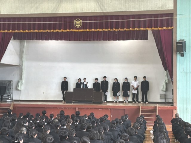 本日、生徒会朝礼を行いました。校長先生より、生徒会役員および各種委員長から、先日の一斉委員会の報告として、前期の活動方針や活動内容について発表がありました。