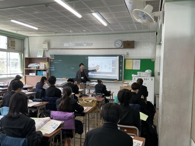 1年生の英語では、Lesson1を学習しています。デジタル教科書を用いて解説を行い、ワークシートにまとめています。